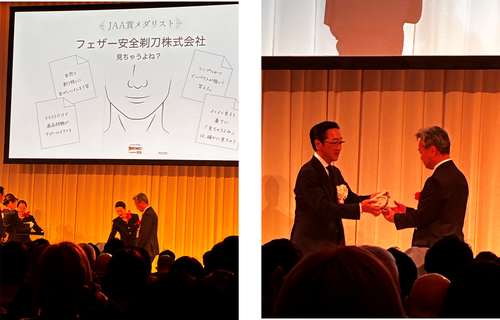 当社製品「サムライエッジ」の広告は、第63回JAA広告賞「消費者が選んだ広告コンクール」において、996件の応募の中から入賞67作品に選ばれ、プリント広告部門で「メダリスト」を受賞いたしました。描かれた人物の鼻の下などに小さく「見ちゃうよね」の文字を記したデザインで、「意外と目立つ剃り残しに。」のキャッチコピーに強い説得力とユーモアを与えて製品を訴求しています。