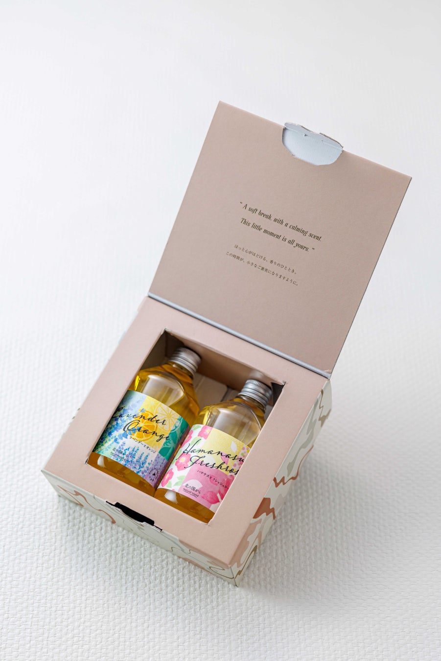 特別なギフトBOXに、アロマバスエッセンス2本(各300mL)を詰め合わせました。