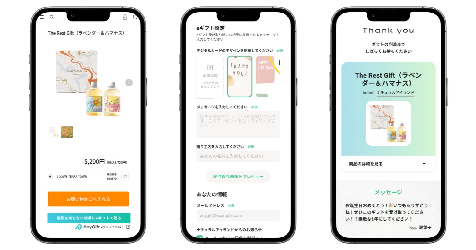 今回、AnyGiftの提供により、「ナチュラルアイランド公式通販」にて一部の商品がeギフトとして贈れるようになりました。