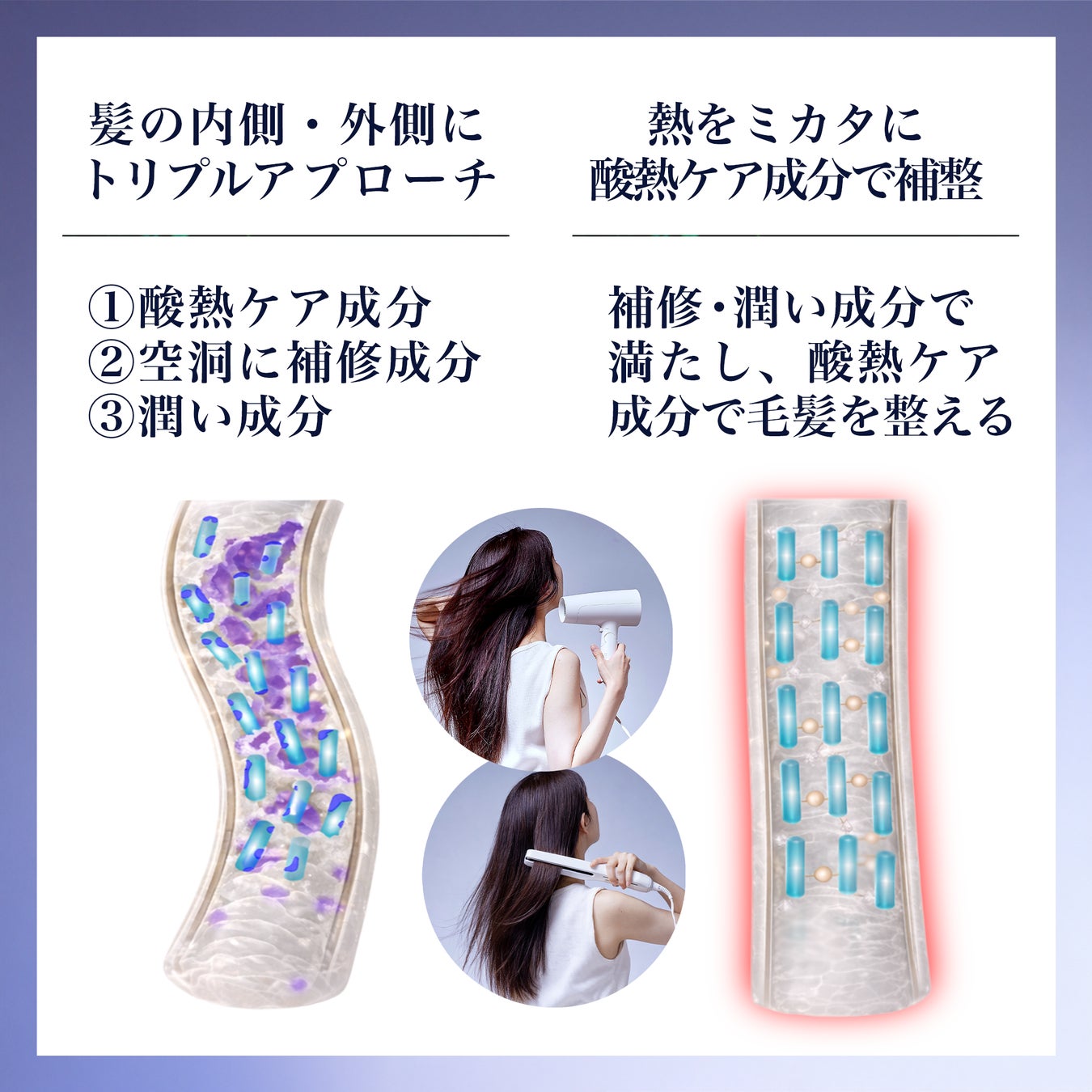 ドライヤーやヘアアイロンなどの熱を与えることで、毛髪表面をコーティングし、なめらかに整った状態へ。