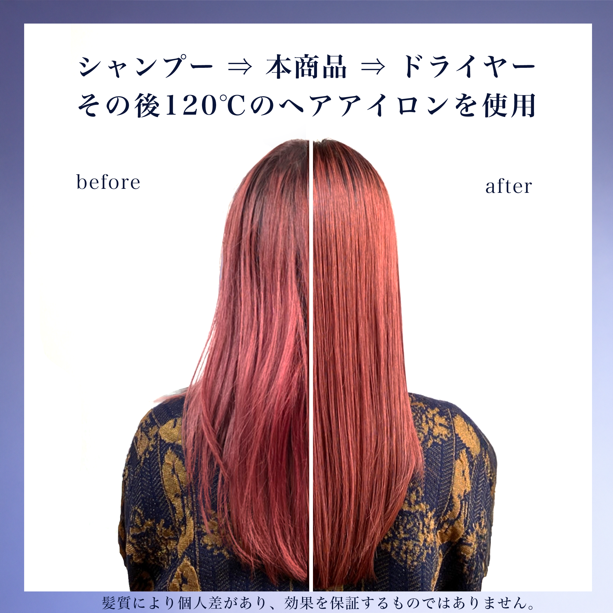 シャンプーとトリートメントの間に”差し込み”、ドライヤーやアイロンの熱で整えます。