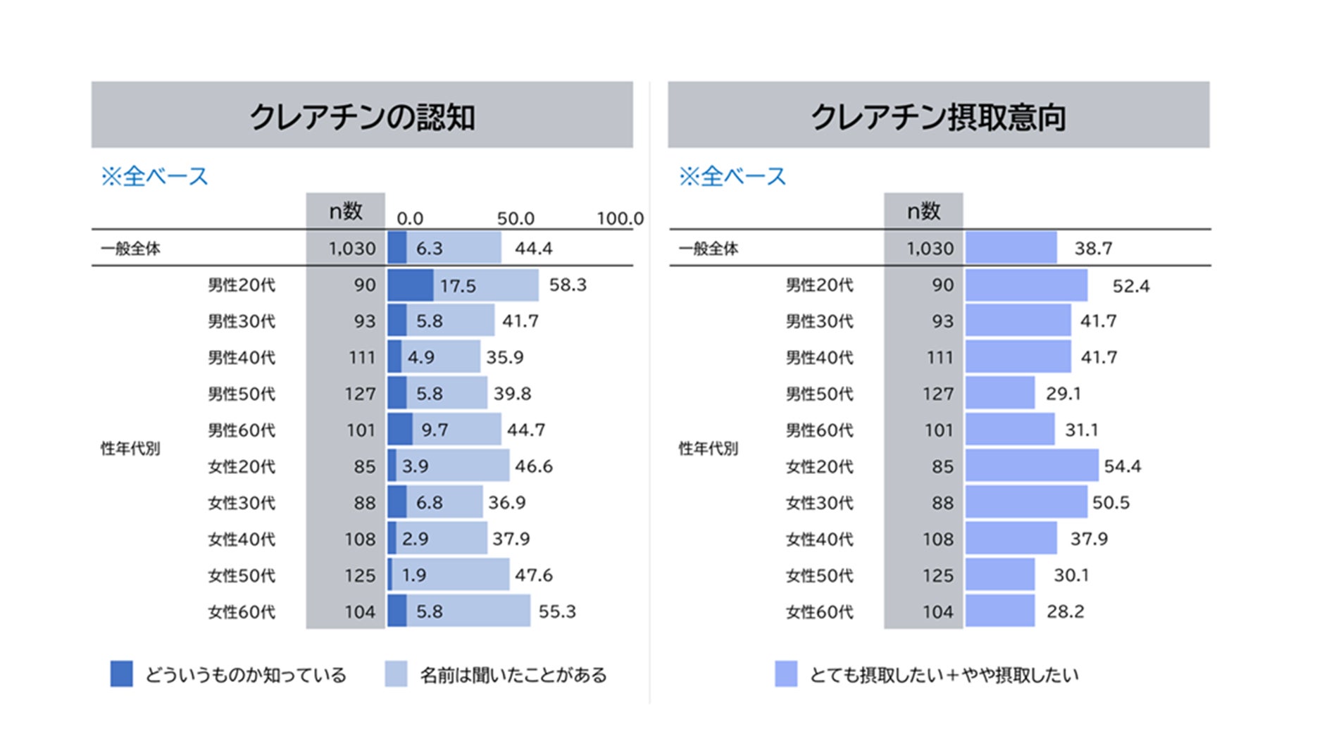 ※1認知調査の概要:インターネットリサーチ 関東 一都三県、関西 二府四県の20~69歳の男女1,650サンプルに対して、認知度を調査。クレアチンの認知については、n=1030。調査期間は、2025年10月15日(水)~10月16日(木)。