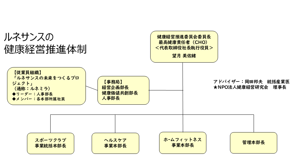 経営トップと各部門役員による「健康経営推進委員会」に加え、部門横断型の「ルネサンスの未来をつくるプロジェクト」※2を設置し、各事業・機能部門が主体的に連携し、実行力を高める体制を整えています。