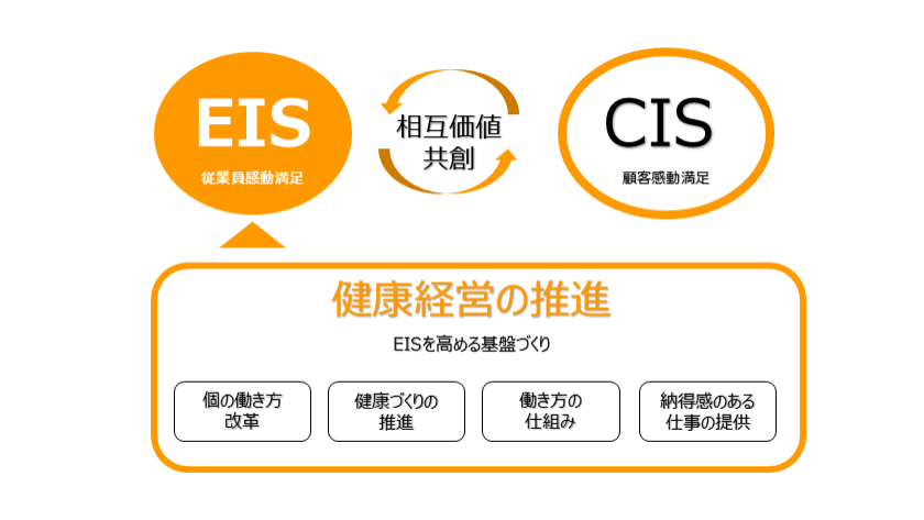 「従業員感動満足(EIS)」と「顧客感動満足(CIS)」の好循環がすべてのステークホルダーの「生きがい創り」につながるという考えのもと、人的資本経営の一環として健康経営を推進しています。