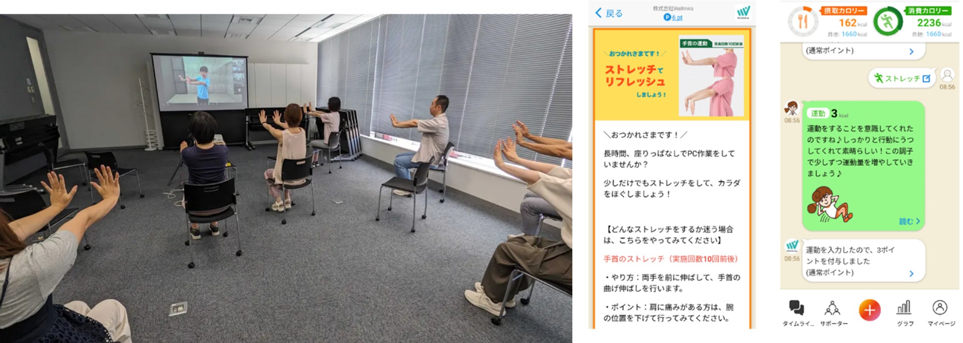講習会後3週間、当社が開発・運営するAI健康アプリ「カロママ プラス」を活用し、ストレッチや運動などの健康行動でポイントが貯まるイベントを実施し、ストレッチなど健康行動の継続・定着化を図りました。