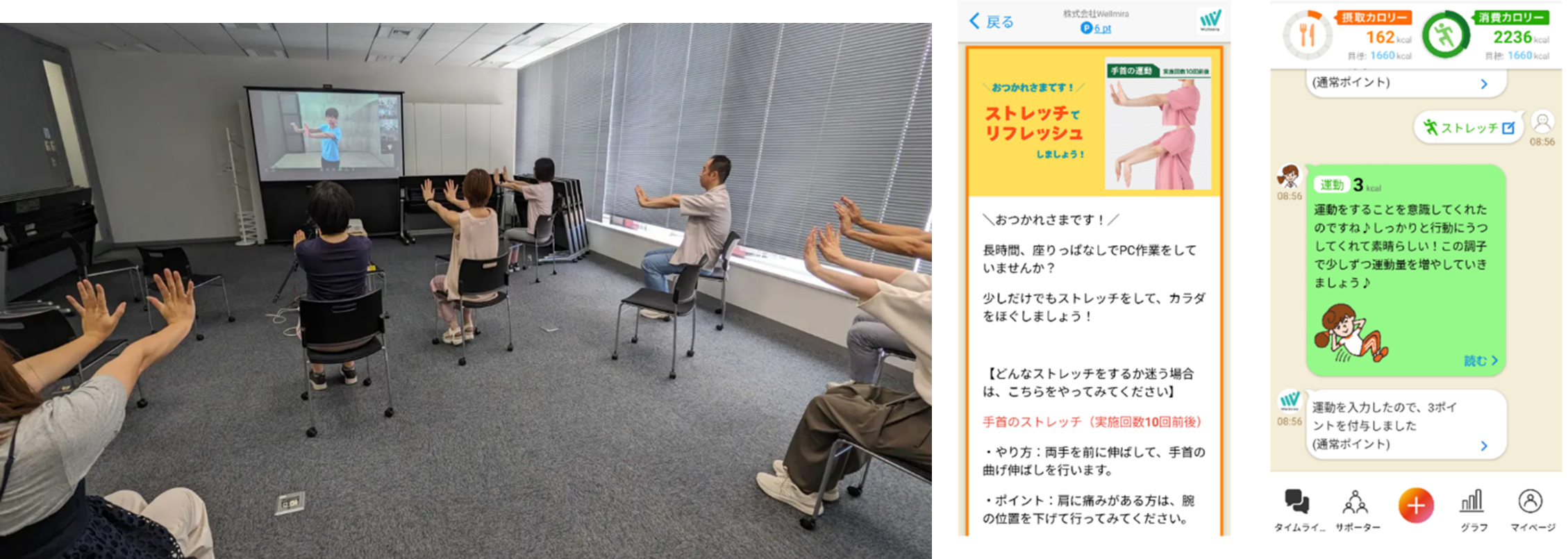 講習会後3週間、当社が開発・運営するAI健康アプリ「カロママ プラス」を活用し、ストレッチや運動などの健康行動でポイントが貯まるイベントを実施し、ストレッチなど健康行動の継続・定着化を図りました。