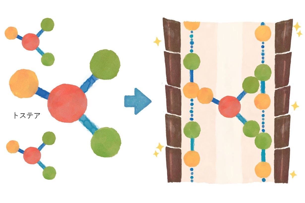 トステア(アミノエチルチオコハク酸ジアンモニウム)は、髪内部に浸透するとタンパク質を構成するアミノ酸と結合し、髪のダメージを補修してハリやコシを与えるほか、キューティクルを引き締めて髪にツヤを与えます。