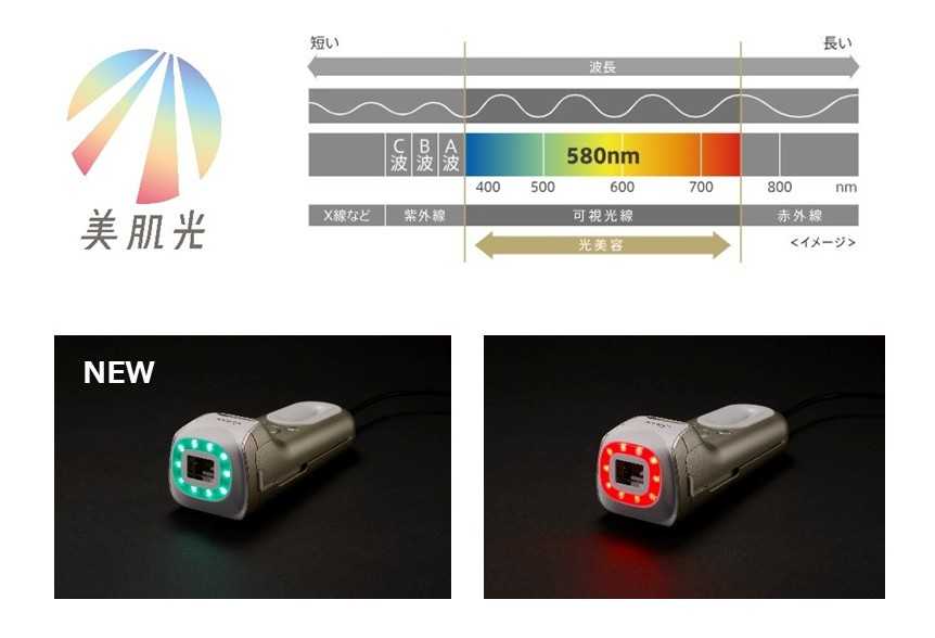 「レイボーテ」に採用しているIPLの光領域は、肌に良い影響を与える可視光線の中でも580nm付近の波長を含み、刺激になりやすい領域をカットしています。加えて、ヤーマン独自のLED「美肌光」を搭載し、ハリ・うるおい*⁷など肌自体の美しさを引き出します。LEDアタッチメントには赤色LEDに加え、特許取得*⁸の青緑LEDを新搭載。紫外線の気になる季節も、明るく透明感*⁶のある肌へ導きます。