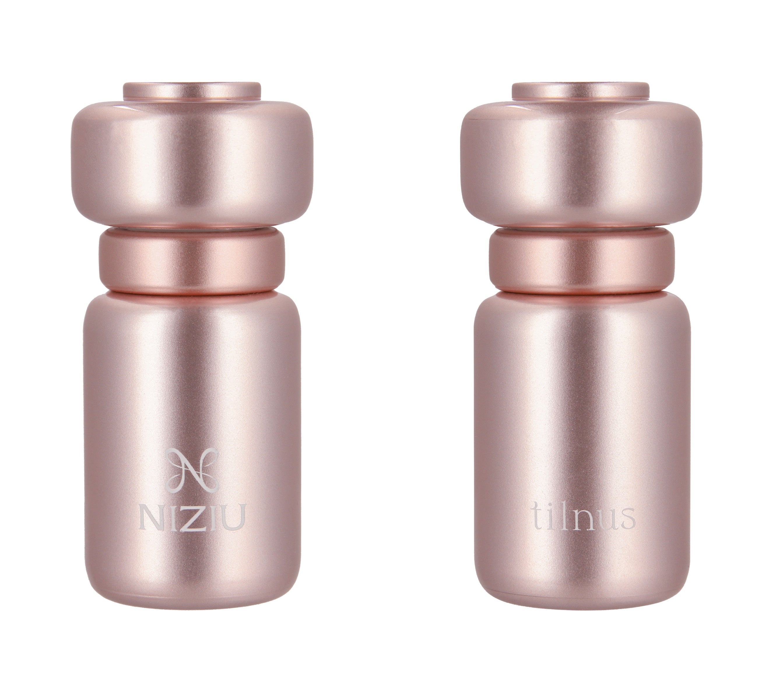 容器はキラキラと輝くメタリックピンクカラーを採用。正面にはNiziUロゴをあしらいました。