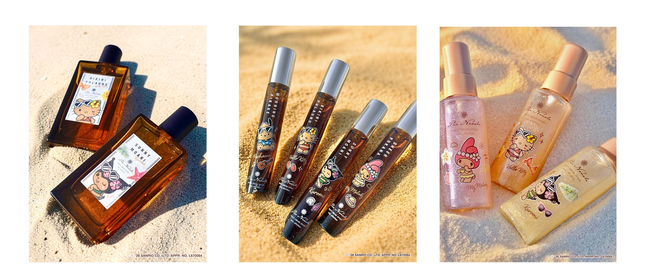 今回サンリオキャラクターズとコラボレーションをするのは、「プア ナナラ」の人気の香り3種と新作1種。新しく仲間入りした「ビキニプラウヌ」は、「日焼け肌」にちなんだ今回のコラボレーションで初お披露目となる香りです。海辺の情景からインスピレーションを得た、夏にぴったりの心地よい香りをお楽しみください。