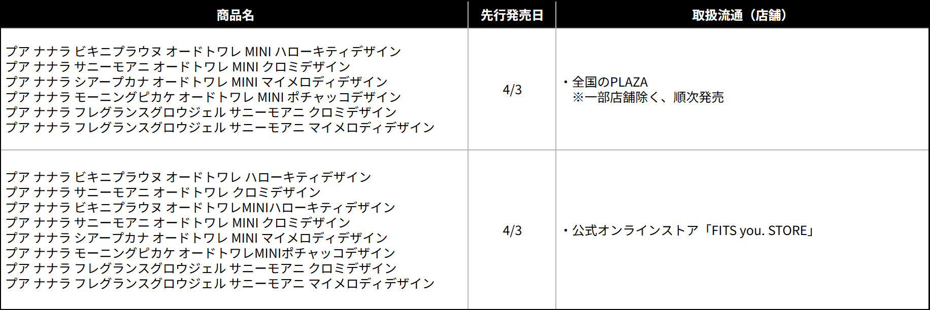 株式会社フィッツコーポレーション(本社:東京都港区、代表取締役:富樫康博)は、“みちょぱ”ことモデルの池田美優さんがプロデュースするフレグランスブランド「プア ナナラ」より、株式会社サンリオの日焼けしたデザインの「ハローキティ」「クロミ」「マイメロディ」「ポチャッコ」とコラボレーションした限定パッケージの香水とフレグランスジェルを、2026年4月18日(土)から、数量限定で発売いたします。また、一般発売に先駆け、一部製品に関して、全国のPLAZA(一部店舗除く)、公式オンラインストア「FITS you. STORE」にて、2026年4月3日(金)より先行発売を順次開始いたします。