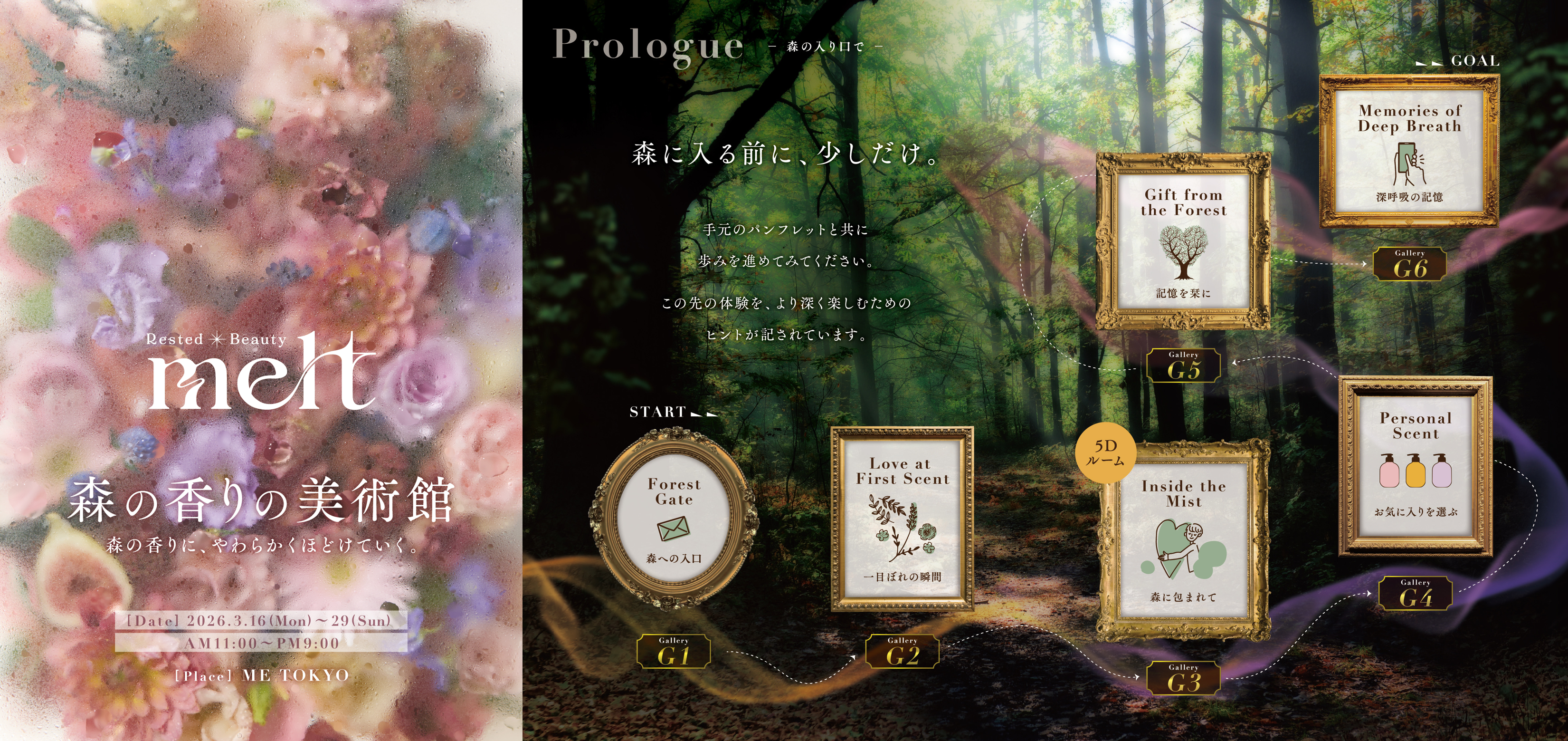 花王株式会社のヘアケアブランド「melt(メルト)」は、都会の真ん中で森林浴を楽しめる「森の香りの美術館」を、METOKYO IKEBUKUROにて2026年3月16日(月)から3月29日(日)までの期間限定でオープンします。本イベントでは、パンフレットを片手に美術館を巡るように鑑賞しながら没入できる、香りと髪をテーマにしたアート型導線の体験を提供します。深呼吸したくなる香りに包まれる没入型の映像演出をはじめ、視覚や嗅覚などの感覚で楽しめる“5Dの森林浴体験”や香りの展示アートなどを通じて、自分に合った香りと出会い、ブランドが提案する“休みながら美しく、休息美容”なひとときをお届けします。