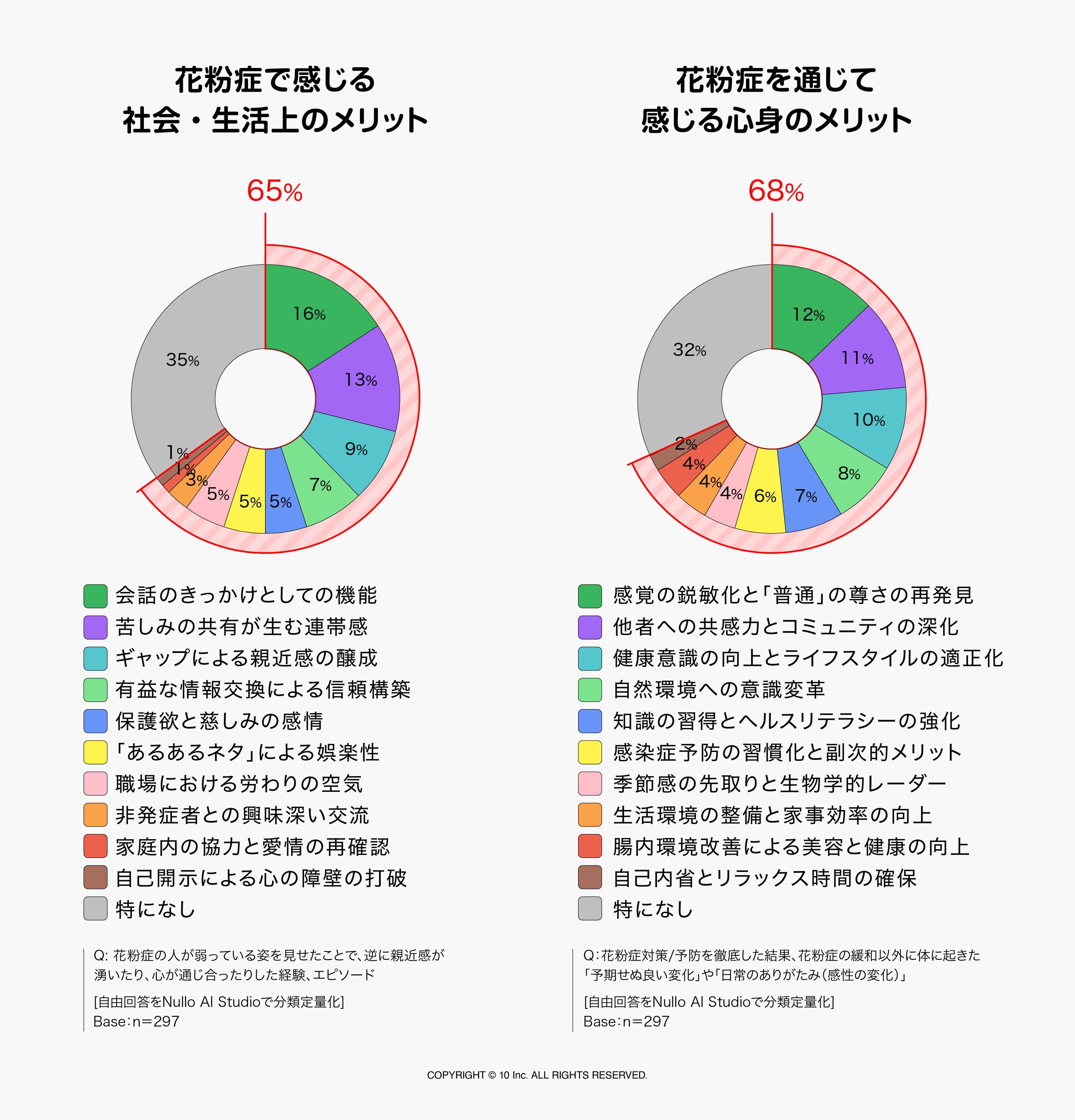 10 Inc.では、オンラインコミュニティ調査(MROC)で得られた自由回答データを、10 Inc.オリジナルAI分析エージェント「Nullo AI Studio」によって分析。定量・定性の両面から、花粉症がもたらす意外な生活・心理効果を明らかにしました。