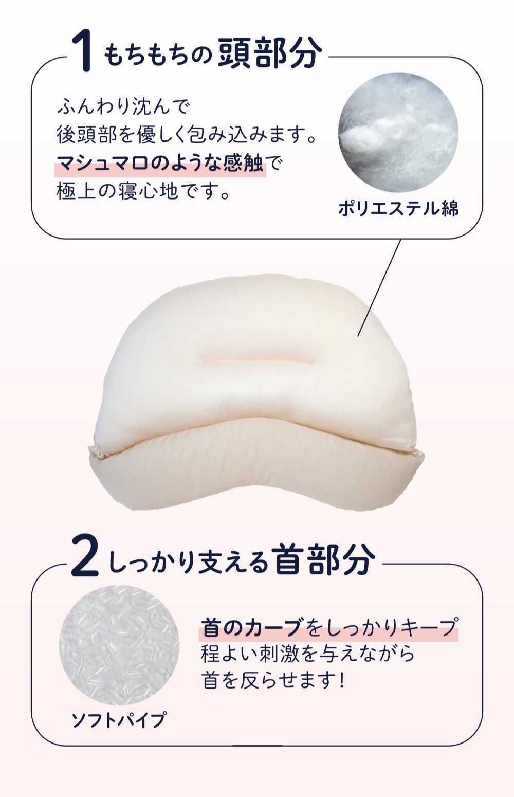 肌触りを重視した頭部分と、首まわりのフィット感を重視した首部分の2層構造の設計にこだわりました。頭部分には綿ともちもちとしたマシュマロ生地を使用し、思わず触れていたくなるようなやわらかな肌触りと、首部分にはソフトパイプを使用し、女性の首に程よくフィットする構造になっています。