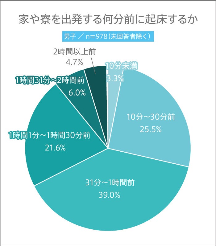 まず、「家や寮を出発する何分前に起床するか」については下記の通りです。