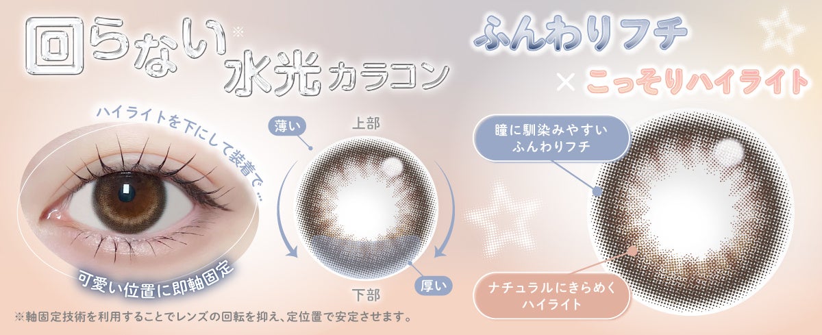 いずれも回らない水光カラコンとなっており、ハイライトを可愛い位置で固定。瞳に馴染みやすいふんわりとしたフチに、微細なハイライトの組み合わせで、まるで光を閉じ込めたようなナチュラルなうるみ瞳を演出します。