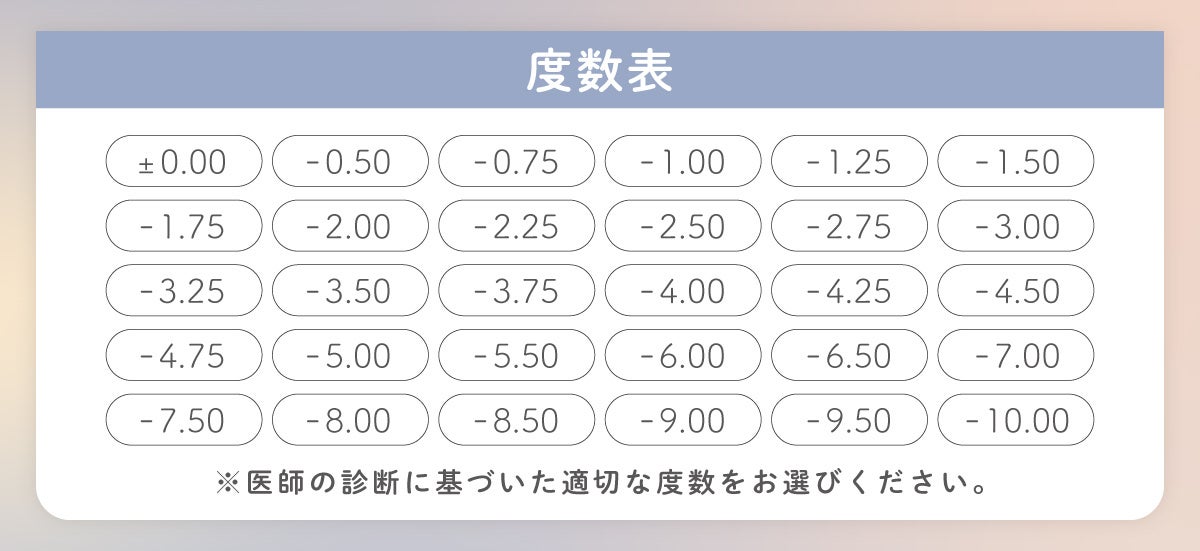 ±0.00(度なし)から-10.00まで、豊富な度数展開もご用意しておりますので、幅広い度数の方にお使いいただけます。