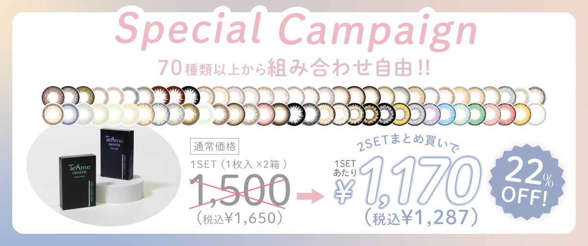 TeAmoのマンスリーカラコンは、1セット(1箱1枚入×2)での販売となっており、両目度数が異なる方でもお手軽にお試しいただけます!