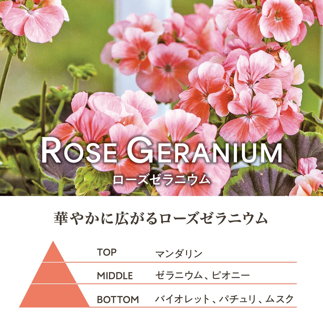 ローズゼラニウムとピオニーが華やかに広がるフレッシュフローラルの香り