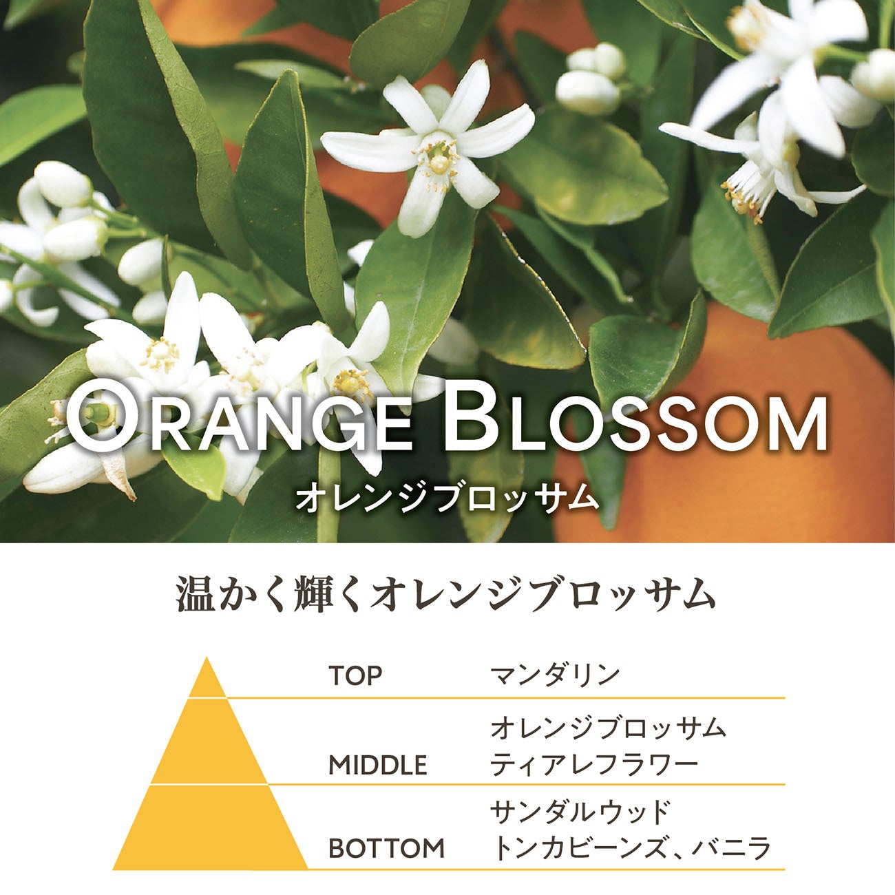 温かく輝く陽射しを感じさせる魅力的なビターオレンジブロッサムの香り