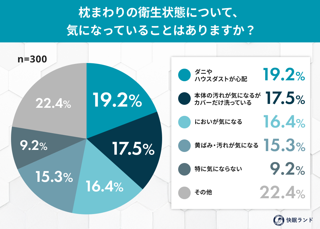 気になる悩みは「ダニ・ハウスダスト(19.2%)」「枕本体の汚れ(17.5%)」「ニオイ(16.4%)」が上位