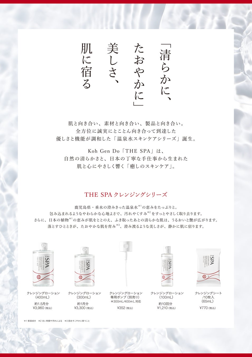 配合水は、天然温泉水*2のみ*3。天然温泉水を89%配合