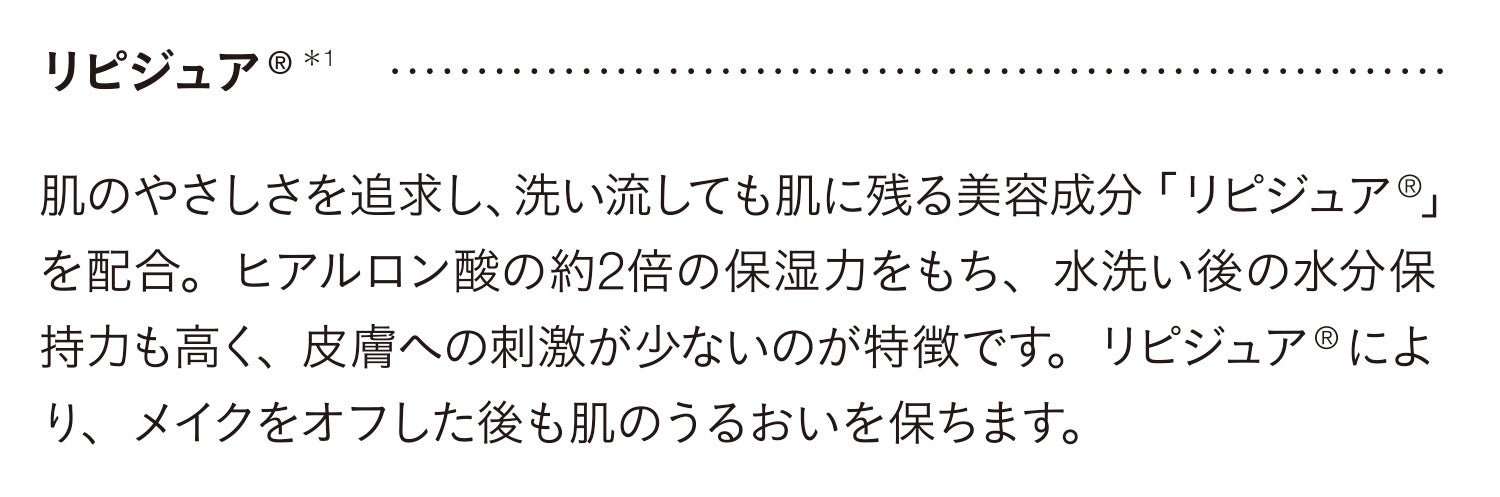 *1 ポリクオタニウム-51<保湿成分> リピジュアは日油株式会社の登録商標です *2 肌のキメを整えること *3 乾燥による *4 うるおいによる *5 ウメ果実エキス *6 シイクワシャー果皮エキス *7 ユキノシタエキス *8 マグワ根皮エキス *9 オリーブ葉エキス *10 セイヨウミザクラ果実エキス *11 ハトムギ種子エキス *12 ウンシュウミカン果皮エキス *13 イチョウ葉エキス *14 ミツバアケビ茎エキス *15 アロエベラ葉エキス *16 ヨモギ葉エキス *17 チャ葉エキス *18 肌に付着した花粉やPM2.5をふき取ること