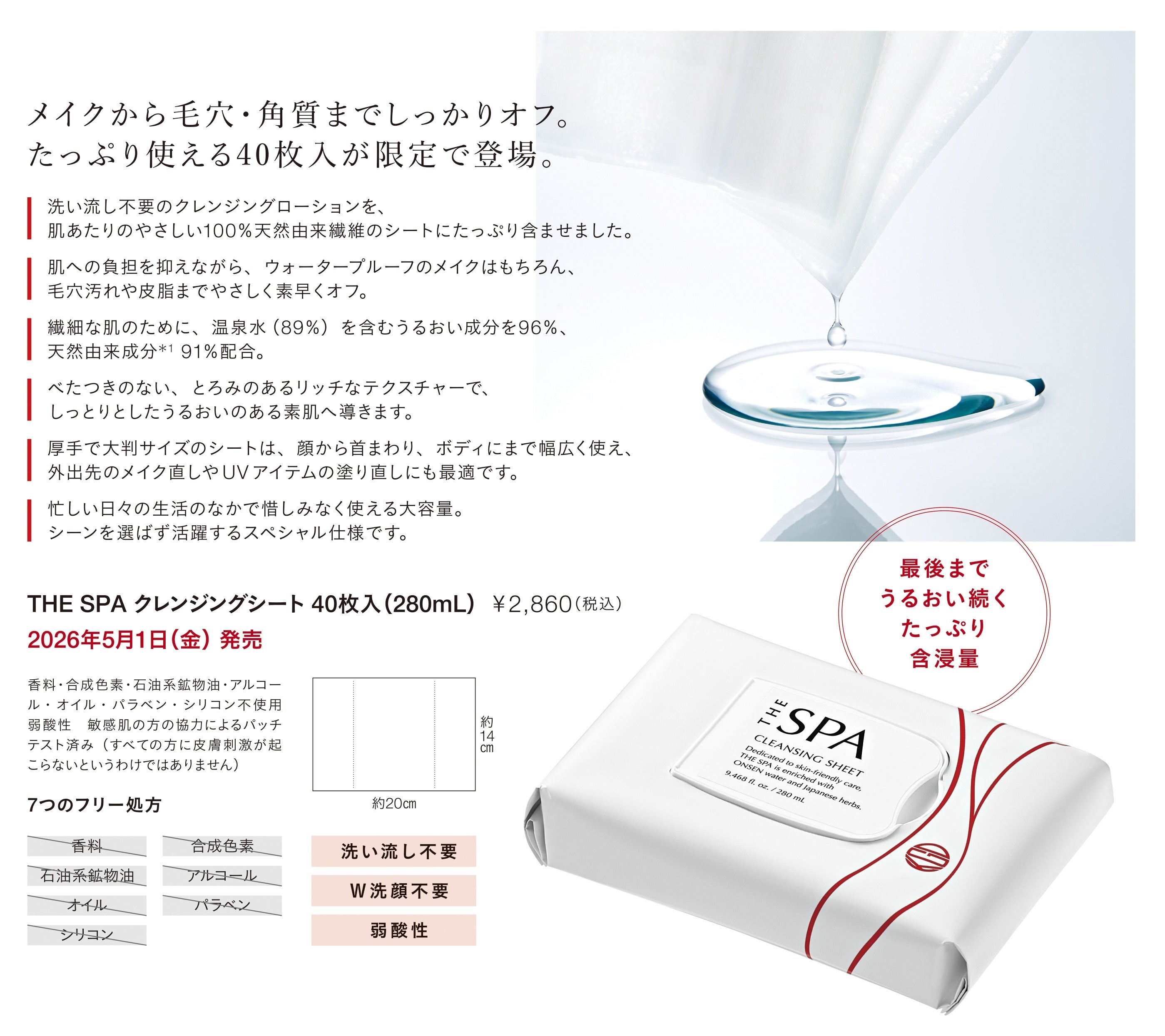 「肌へのやさしさ」と「機能性」を融合させた自然派化粧品を企画販売する江原道(こうげんどう)株式会社(本社:東京都品川区、代表取締役社長:板橋信太郎)は、メイク落としから毛穴・角質ケアまでマルチに使える大容量「THE SPAクレンジングシート40枚入」を、2026年5月1日(金)より数量限定で発売いたします。厚手で大判サイズのシートは、顔だけでなく首まわりやボディにも使用でき、外出先でのメイク直しやUVアイテムの塗り直しにも便利。日常のあらゆるシーンで活躍するスペシャル仕様のアイテムです。