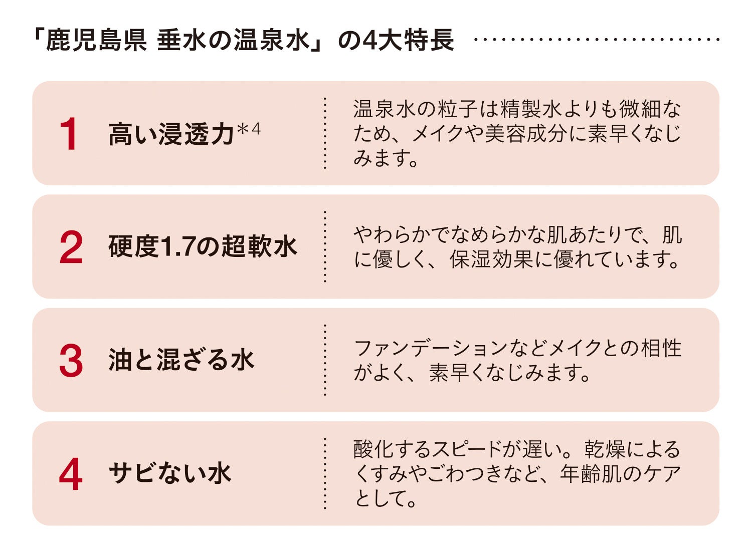 配合水は、天然温泉水*2のみ*3。天然温泉水を89%配合