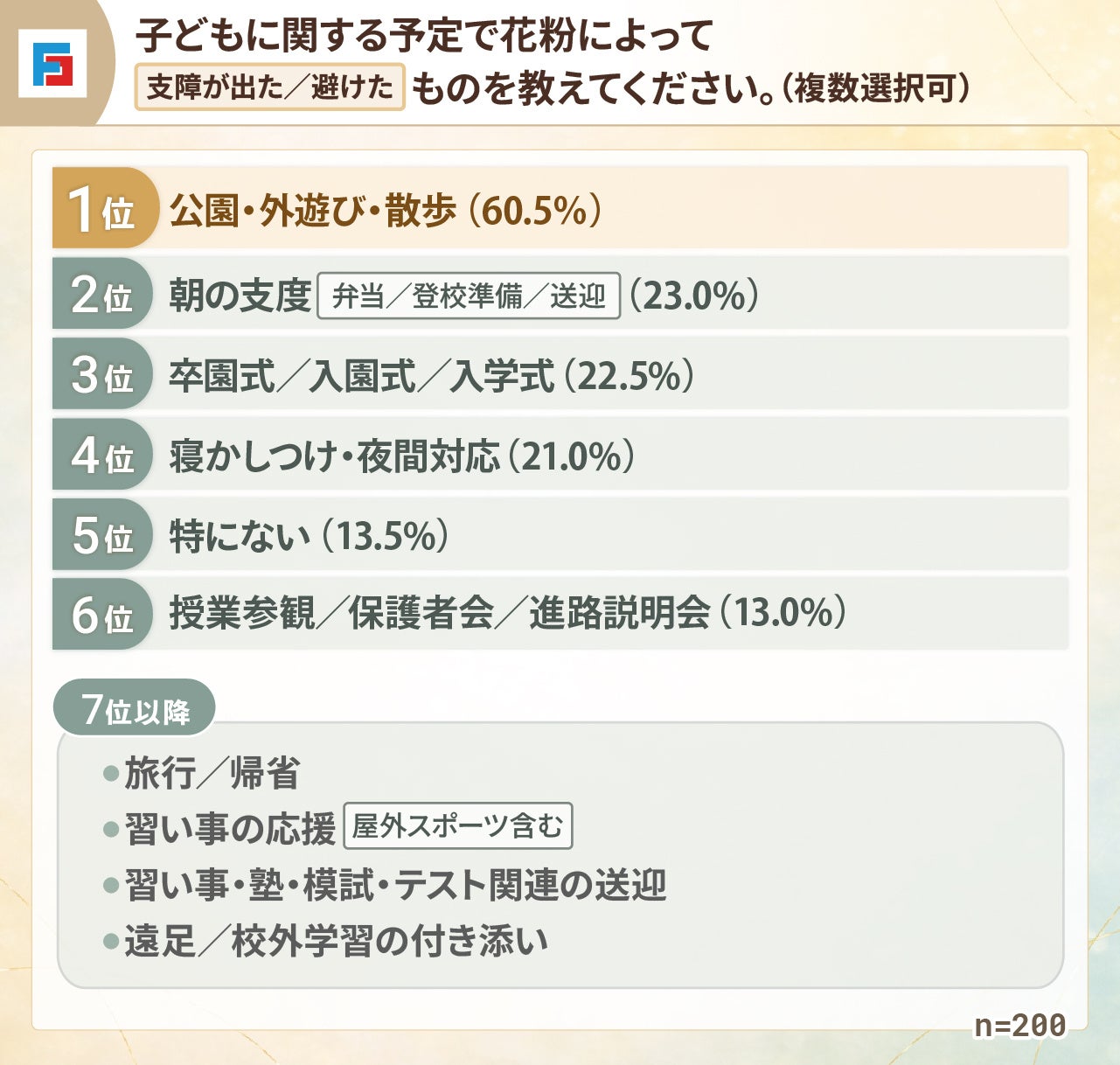子どもに関する予定のうち、花粉によって「支障が出た/避けた」ものの1位は「公園・外遊び・散歩」でした。