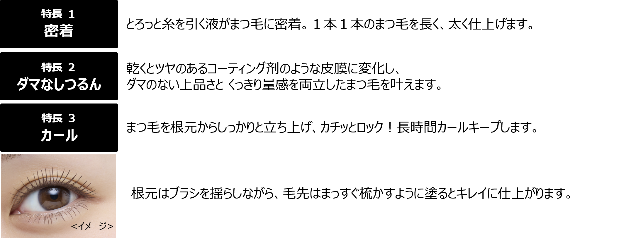 涙・汗・水・皮脂・こすれに強い、独自の耐久処方。24時間カールキープ データ取得済み。