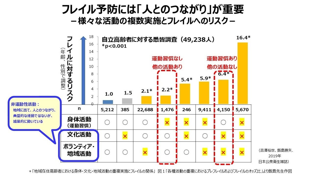 また、「フレイル予防」というと運動が注目されがちですが、飯島先生は「運動だけに偏った指導では、十分な効果が得られない場合がある」と指摘します。講演では、運動習慣がなくとも、文化活動や地域活動などの非運動性の活動に参加している人のほうが、運動だけを習慣にしている人よりもフレイルリスクが低いという研究結果が示されました。仲間と関わり、目的を共有しながら過ごす時間は、心の張り合いや生活のリズムを育み、結果的に身体を動かすことにもつながります。