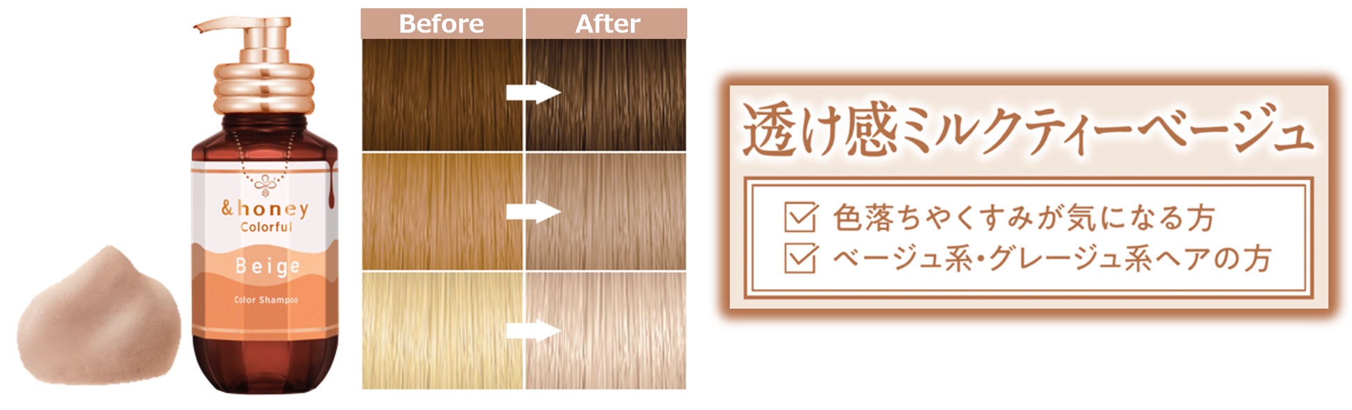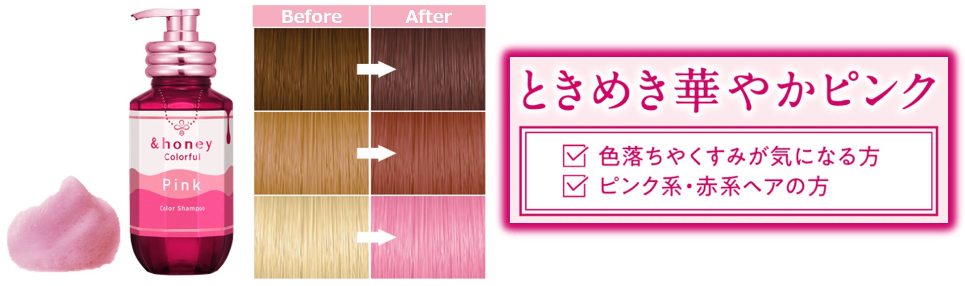 カラーをプラスする染色成分はもちろん、アンドハニーの強みである「ハチミツ*1の保水力」に、ダメージ補修・褪色抑制成分などカラー後の髪に必要な成分も配合した、「染めた後も美しさが続く」を実感できるアイテムです。