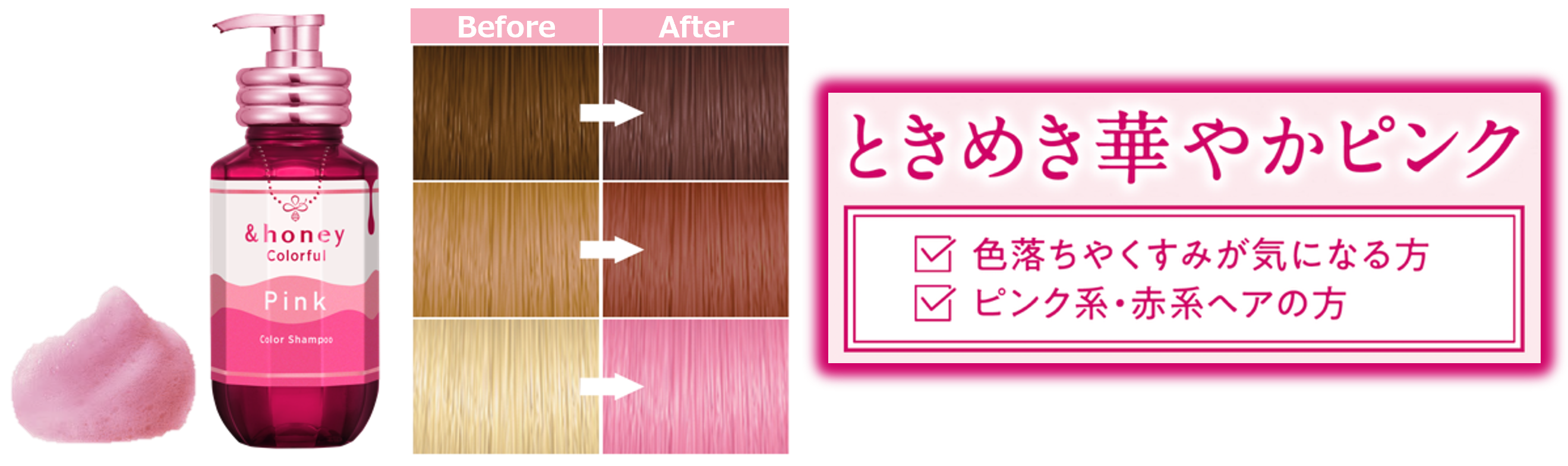 カラーをプラスする染色成分はもちろん、アンドハニーの強みである「ハチミツ*1の保水力」に、ダメージ補修・褪色抑制成分などカラー後の髪に必要な成分も配合した、「染めた後も美しさが続く」を実感できるアイテムです。