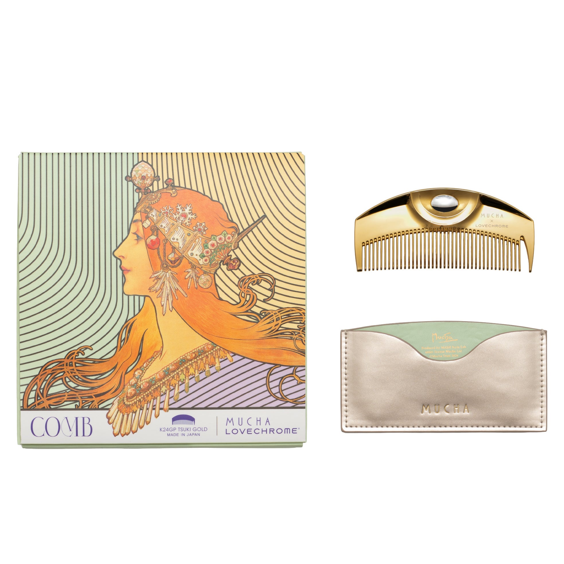 株式会社マッシュスタイルラボ(本社 東京都千代田区/代表取締役社長 近藤広幸)が展開する、芸術家・ミュシャ財団による世界初の公認ブランド「MUCHA(ミュシャ)」は、日本の美髪コームブランド「LOVECHROME®(ラブクロム)」との初のコラボレーションアイテム『MUCHA×LOVECHROME®K24GP TSUKI ヘアコーム』を、2026年3月12日(木)よりMUCHA全店舗およびオフィシャルオンラインストアにて発売いたします。LOVECHROME®の純金加工モデル「K24GP TSUKI」をベースに、ミュシャ作品『ゾディアック』に象徴される流れるような髪の曲線から着想を得たアートをあしらった特別デザインBOXで展開。また同BOXと同アートを使用したハンカチも、MUCHAのアイテムとして同日発売いたします。