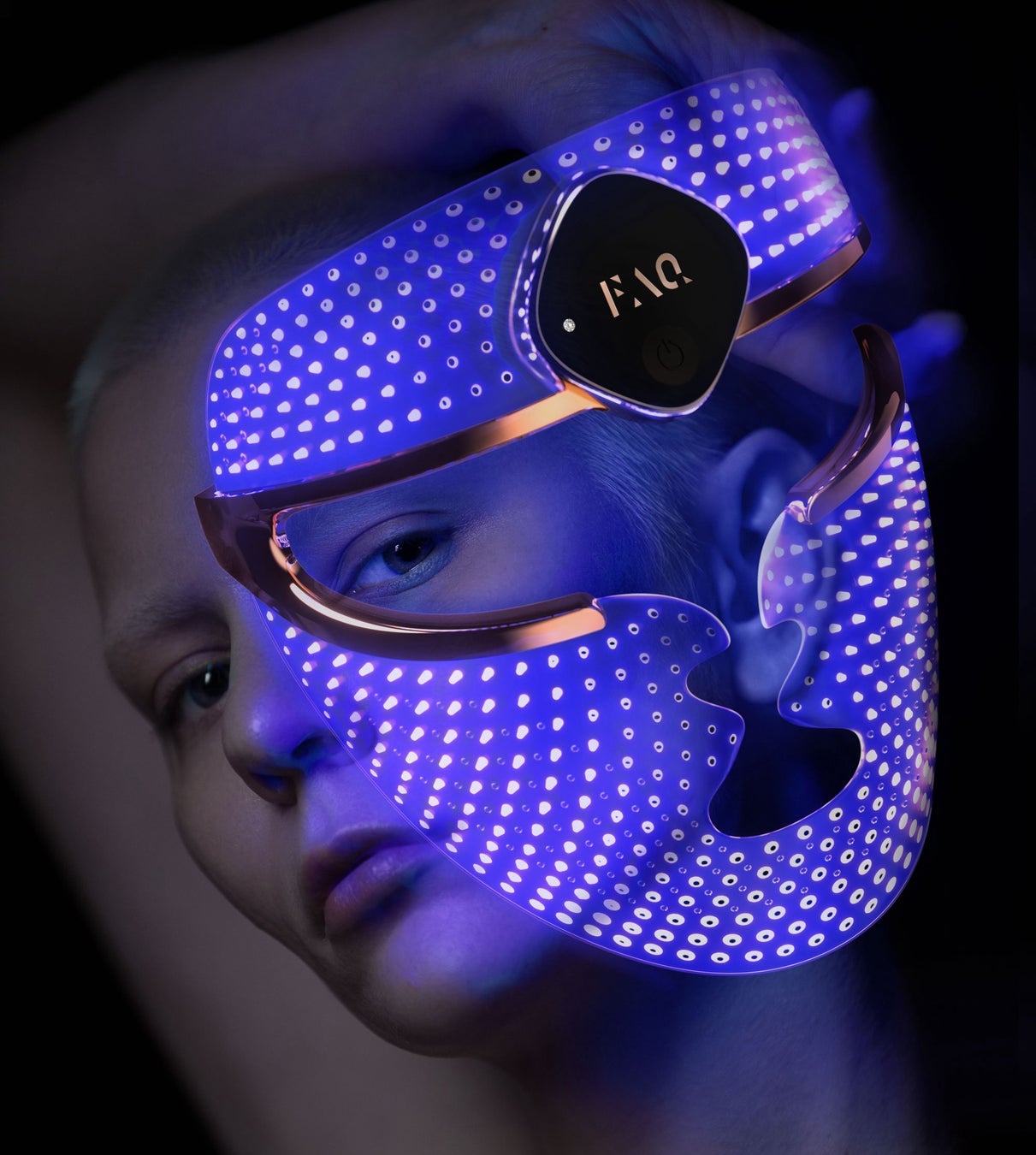 続いて、超軽量のフレキシフィットシリコーンを採用した「FAQ™ 202」LEDマスクを顔全体に装着します。「第二の肌」のように密着し、近赤外線(NIR)を含む8種類のLED波⻑を肌へ均一に届けます。NIRが肌をじんわりと温めて柔らかくすることで、メイクアップ前の肌に圧倒的なツヤとなめらかさを与え、ランウェイに向けた最終コンディションを整えます。