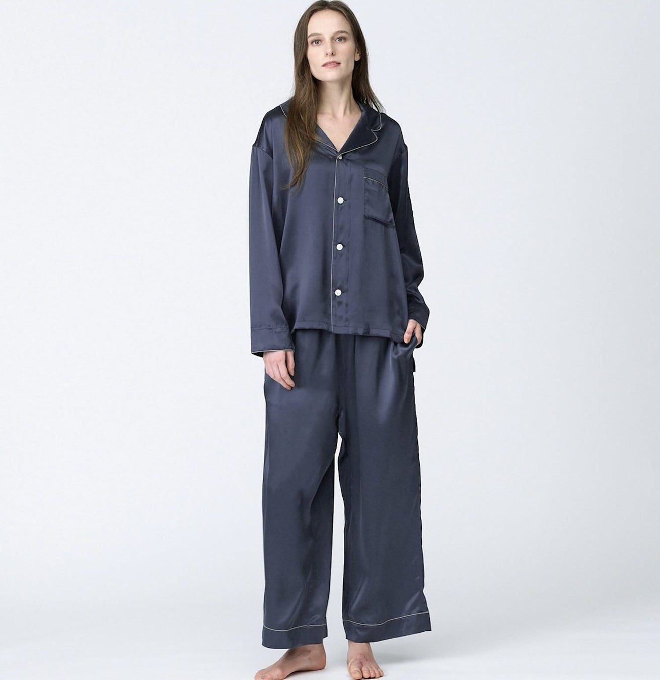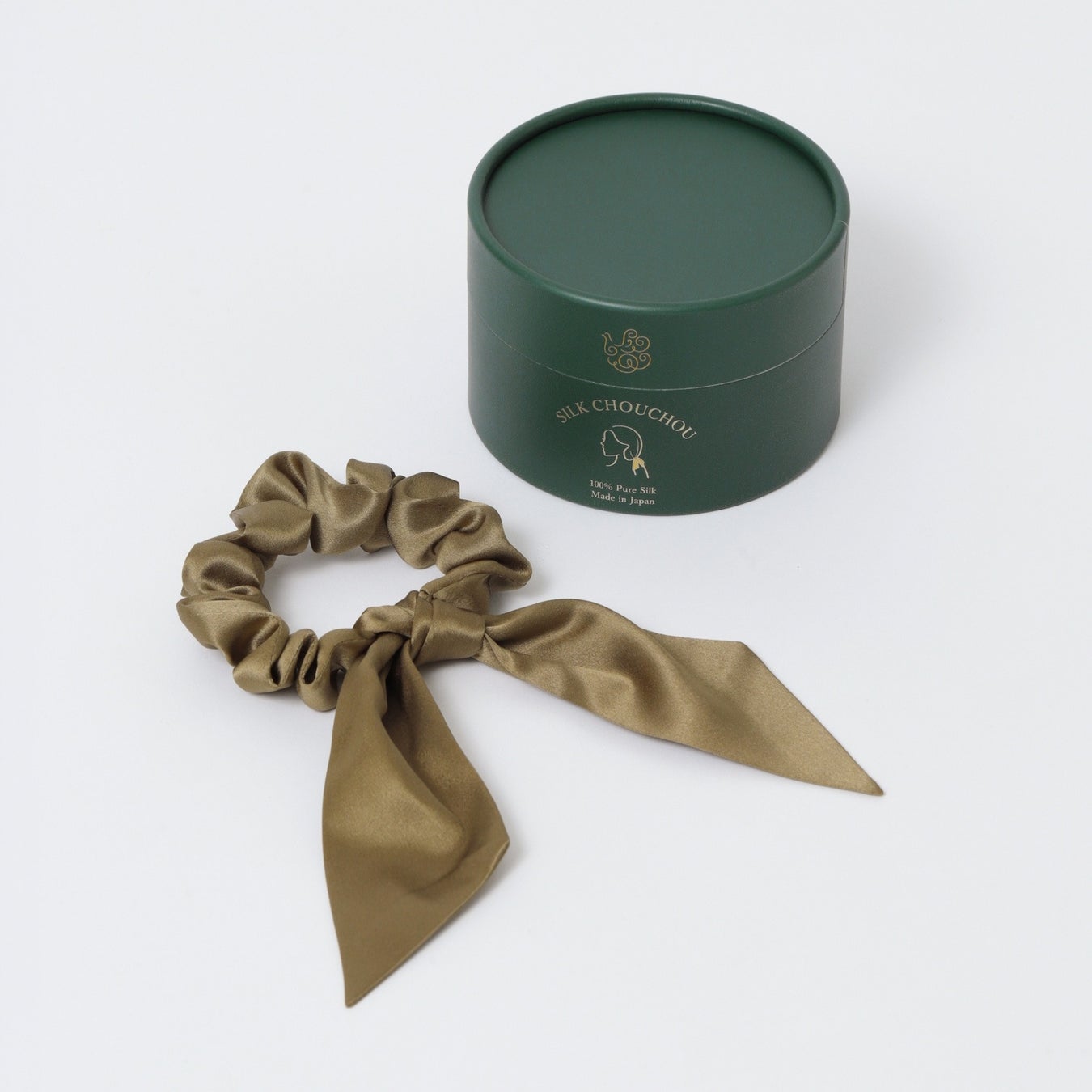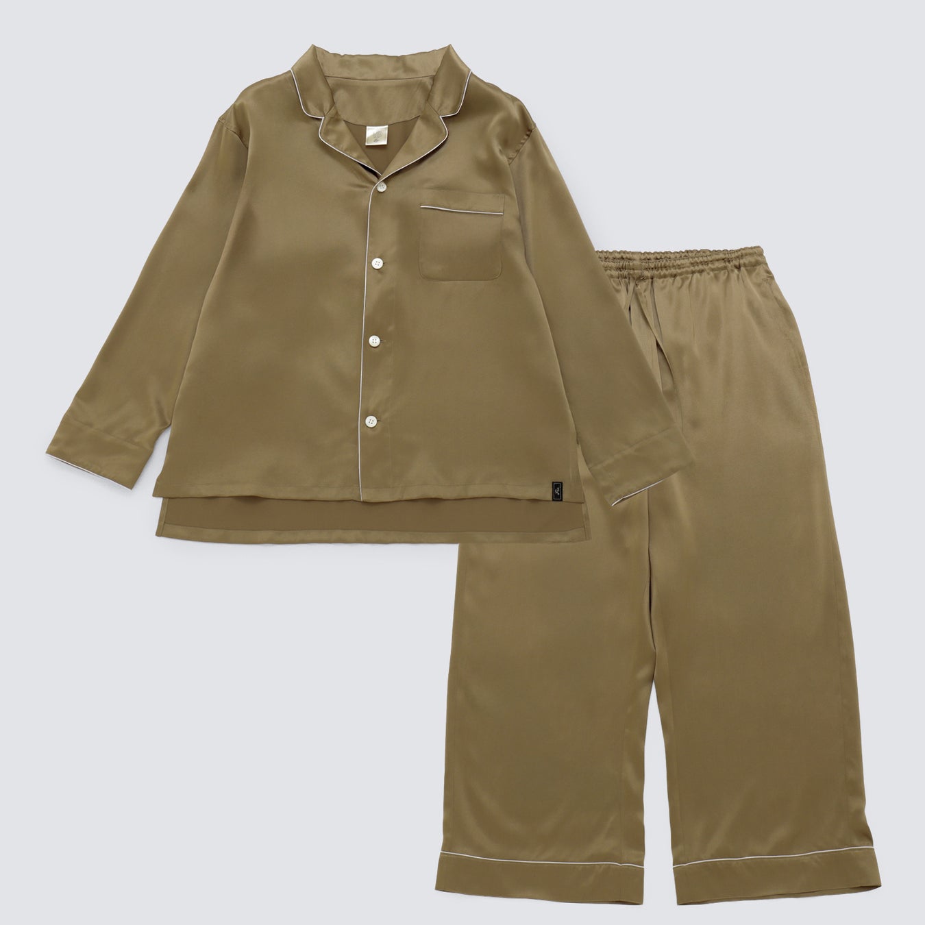 日本橋三越本店限定色「三越ブロンズ」のシルクパジャマ。本製品の襟元に施されたシルバーパイピングは、日本橋三越本店を象徴する天女像の襟元を意匠化し、細部に至るまで丁寧に仕立てた意匠です。同色のシルクリボンシュシュは数量限定販売。ぜひ店頭でお試しください。