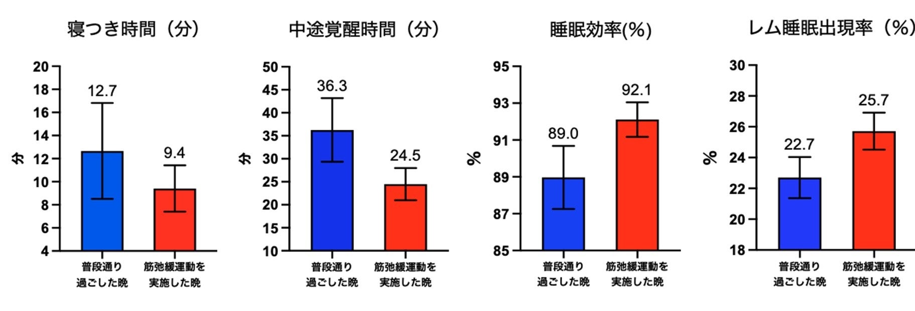 睡眠脳波測定による検証実験では、筋弛緩運動を実施した晩は、就寝前にスマホを操作するなどの「日常習慣」で過ごした晩との平均値の比較で寝つきまでの時間や夜中に目が覚める時間(中途覚醒)が減少し、布団に入っている時間の中で実際に眠れていた割合を示す「睡眠効率」が上昇する傾向が認められました。さらに、重要な睡眠であるレム睡眠の割合が22.7%から25.7%へと有意に増加しており、睡眠全体の質の改善が客観的なデータからも示唆されました。