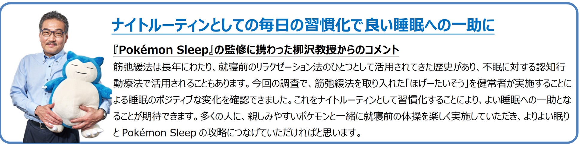 睡眠研究の世界的権威で、『Pokémon Sleep』の監修に携わった柳沢正史教授(筑波大学国際統合睡眠医科学研究機構)は、今回の調査結果を受け、「筋弛緩法を取り入れた『ほげーたいそう』を健常者が実施することによる睡眠のポジティブな変化を確認できました。ナイトルーティンとして習慣化することにより、良い睡眠への一助となることが期待できます。」とコメントしました。