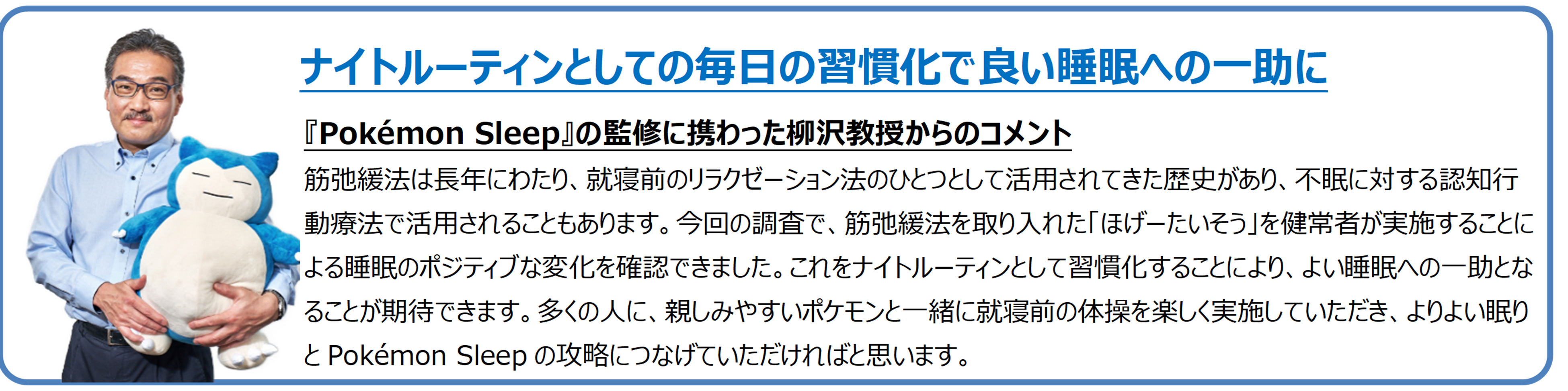 睡眠研究の世界的権威で、『Pokémon Sleep』の監修に携わった柳沢正史教授(筑波大学国際統合睡眠医科学研究機構)は、今回の調査結果を受け、「筋弛緩法を取り入れた『ほげーたいそう』を健常者が実施することによる睡眠のポジティブな変化を確認できました。ナイトルーティンとして習慣化することにより、良い睡眠への一助となることが期待できます。」とコメントしました。