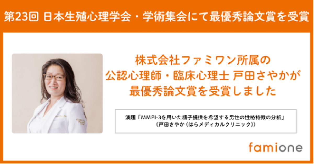 「子どもを願うすべての人によりそい 幸せな人生を歩める社会をつくる」をビジョンに掲げ、法人の従業員向け福利厚生や自治体の住民向け支援を行うヘルスケアサポートサービス「ファミワン」 https://famione.com/benefit/ などを展開する株式会社ファミワン(本社:東京都渋谷区、代表取締役:石川勇介)の専門家アドバイザーである公認心理師・臨床心理士 戸田さやかが、第23回 日本生殖心理学会・学術集会にて、最優秀論文賞を受賞したことを発表いたします。