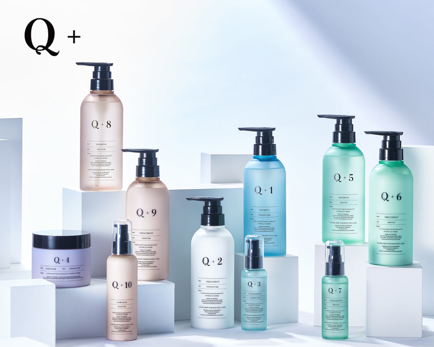 乾燥、毛先のパサつき、広がり、うねり、絡まりなど……ダメージによる髪の悩みは、年齢や髪質、習慣によって様々に異なります。Q+(クオリタス)は、それぞれのダメージによる悩みを考え抜き開発された豊富な商品ラインアップで、サロン品質の仕上がりを叶えるヘアケアブランドです。