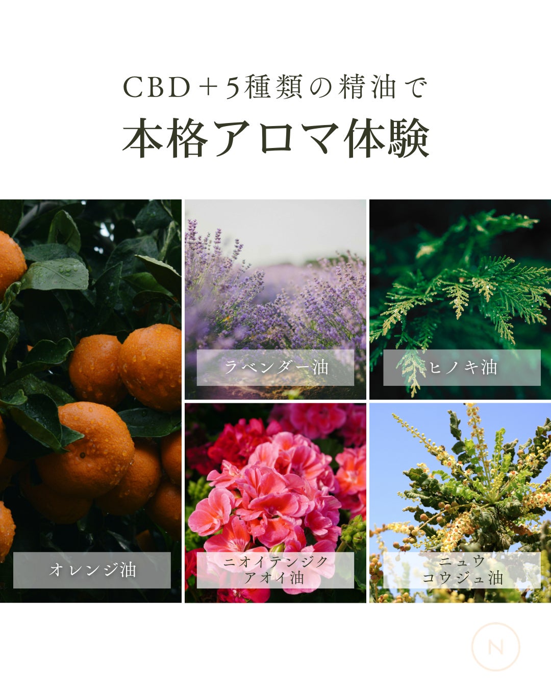 ホホバ種子油、カンナビジオール、オレンジ油、ラベンダー油、ヒノキ油、ニオイテンジクアオイ油、ニュウコウジュ油