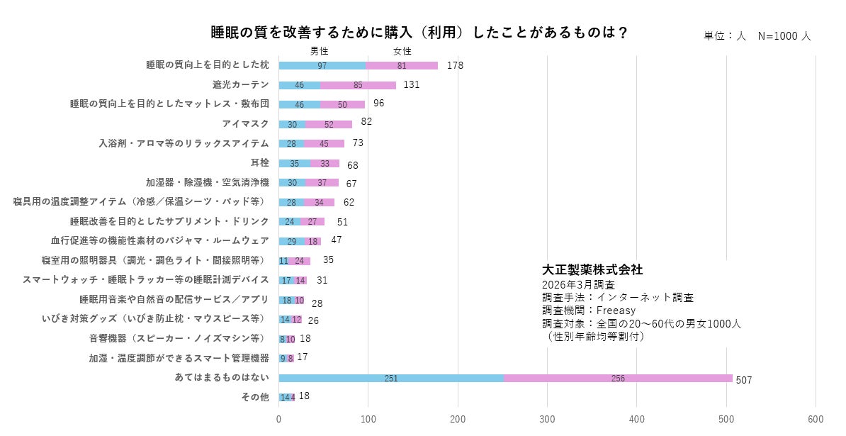 また、「睡眠の質を改善するために購入(利用)したことがあるもの」に関しては、1位が「睡眠の質向上を目的とした枕」(178人)、続いて「遮光カーテン」(131人)、「睡眠の質向上を目的としたマットレス・敷布団」(96人)、「アイマスク」(82人)、「入浴剤・アロマ等のリラックスアイテム」(73人)という結果です。