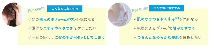 うるおい成分が頭皮と肌の環境を整えることで、ハリ・コシUPをサポート。