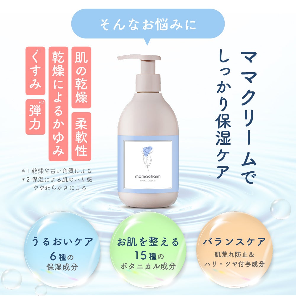 ママチャームのママクリームは、妊娠期から産後までのボディケアを目的に開発された保湿クリームです。乾燥が気になる肌にうるおいを与え、毎日のボディケアとして取り入れやすい処方設計となっています。