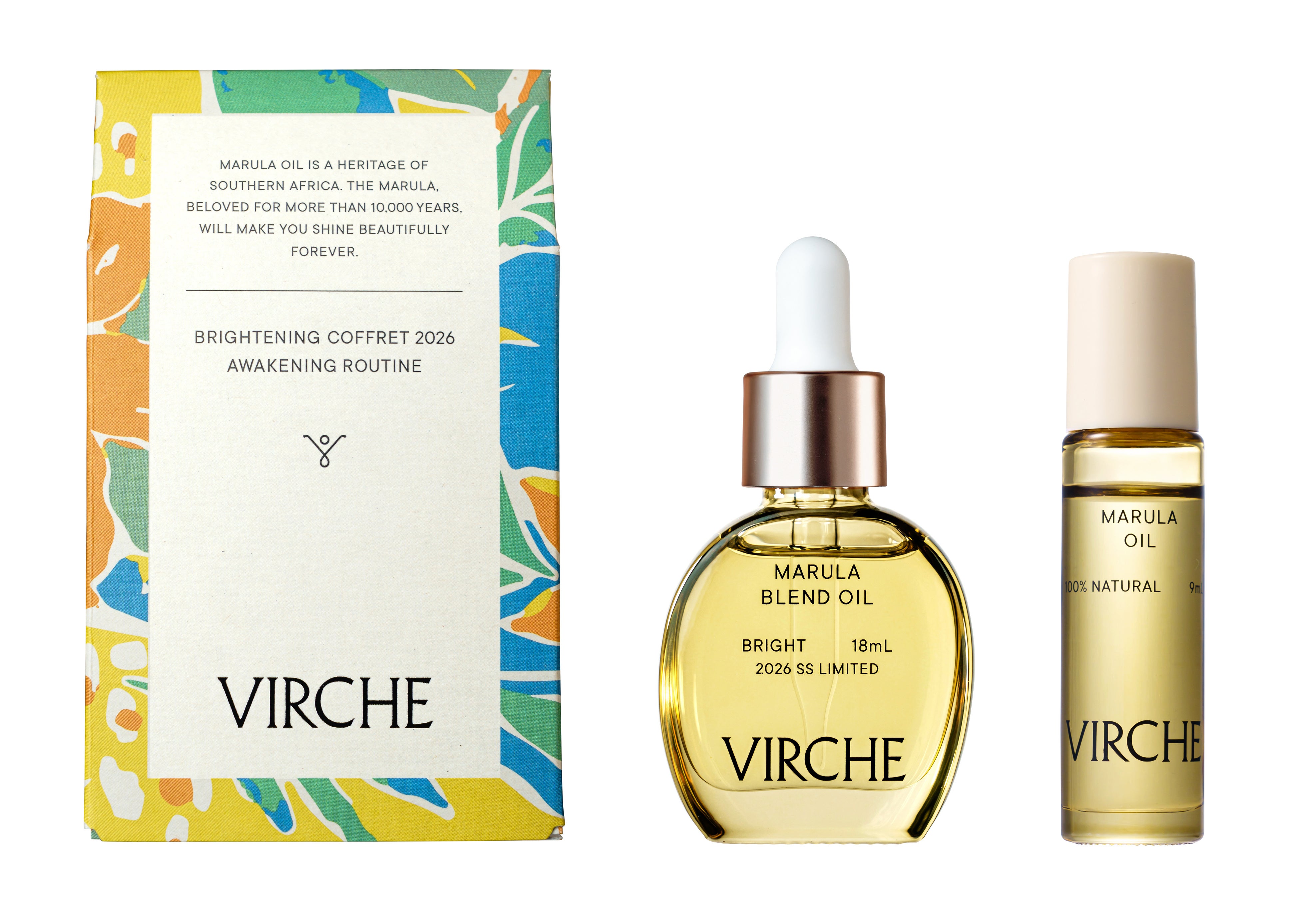 2026年の春のブライトニングコフレは限定香のマルラブレンドオイル[ブライト]18mLとロールオンタイプのマルラオイル9mLのセット。外箱は春に咲き誇る花をイメージした限定パッケージ。香りのコンセプトは”目覚めのシトラスハーバル”。オレンジの天然精油をメインにラベンダーやローズマリーをバランスよく配合。太陽の光をギュッと閉じ込めた明るい柑橘の香りが気分を明るく整えていきます。ロールオンタイプのマルラオイルはサッと気軽に持ち運びができ、日中でも手元や目元、口元の保湿に役立ち、またフェイスラインや首元のマッサージにも使えます。春の不安定な毎日を香りとうるおいで心地よく支える数量限定セットです。