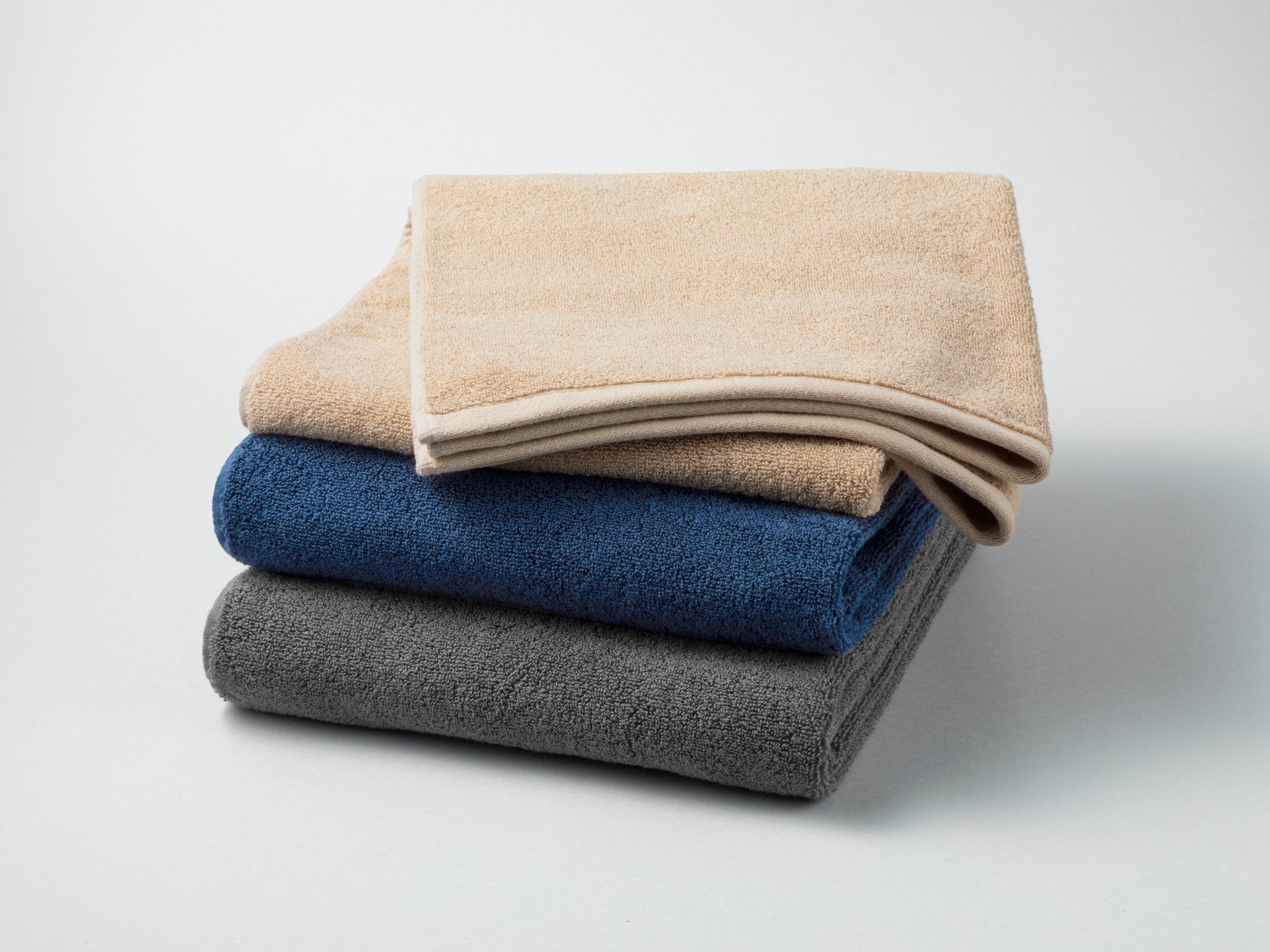 ポリエステル混紡の専用開発糸を使用し、風通しを良くするパイル構造を採用するとともに、乾きにくい原因のひとつであるヘム(短辺の端)を薄く設計しています。