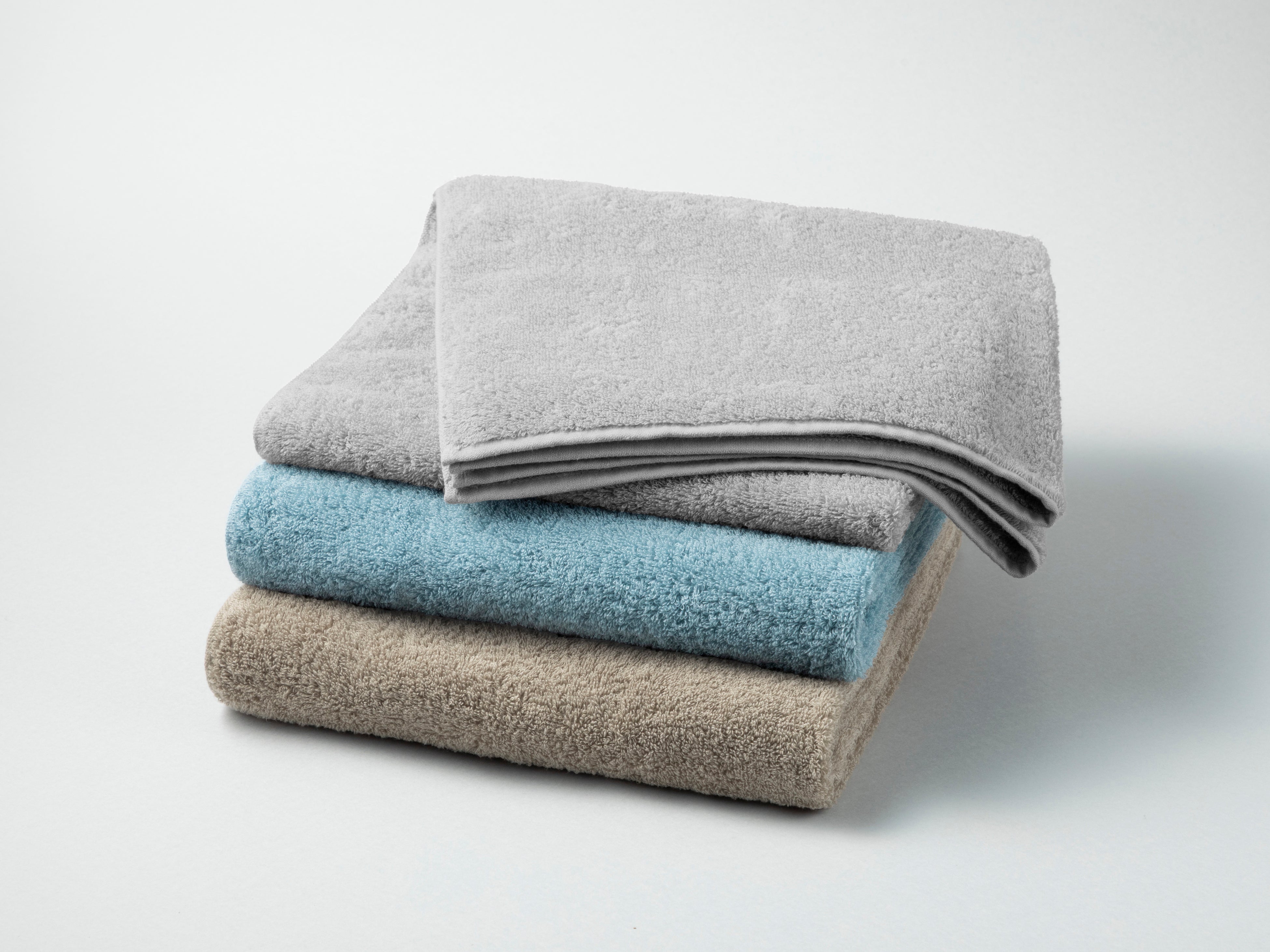ポリエステル混紡の専用開発糸を使用し、風通しを良くするパイル構造を採用するとともに、乾きにくい原因のひとつであるヘム(短辺の端)を薄く設計しています。