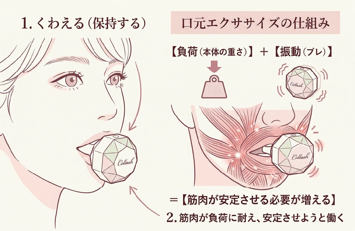 振動がある状態で口元を安定させようとすると、体は無意識に「ブレを抑えよう」とします。この“ブレを抑える働き”は、筋トレで言うところの安定させる筋肉(スタビライザー)が働く状態に近く、口元周辺に「使うきっかけ」を作りやすい考え方です。
